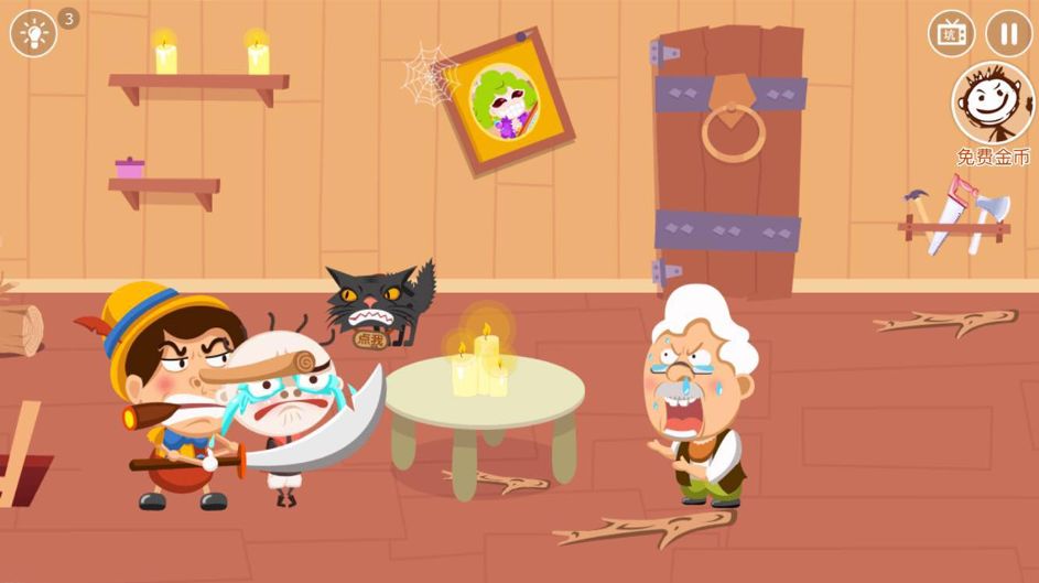 《匹诺曹》的故事相信很多小伙伴都了解过,在这个以“匹诺曹”作为发挥对象的关卡中,能清晰的看到匹诺曹长长的鼻子前端,有木头的纹路,点击后的失败提示提到“木头是不怕疼的”,那么木头怕什么?当然是火!场景中有烛火,却无法移动,地上零散放着的树枝成了关键解谜道具,引燃树枝并放到匹诺曹的鼻头,难题迎刃而解。