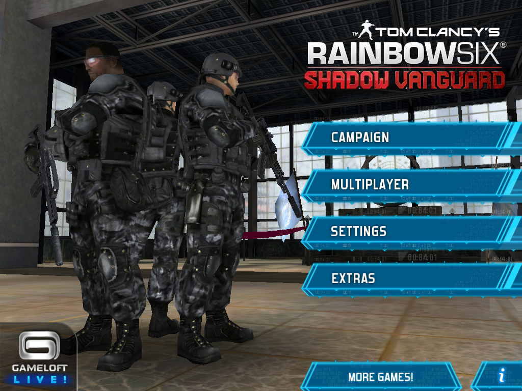 一年一度的育碧(Ubisoft)嘉(chao)年(leng)华(fan)开始了,这次是汤姆克兰西系列中的彩虹六号:围攻,虽然R6并没有预期的那么好,(还有神奇的鬼畜盾)但是旗下Gameloft(智乐)的经典之作,让我着实一惊,相比于MC2,的确有出彩之处。 启动页面也是满满的战斗风格,logo依然白色背景,传统的小队作战在移动设备上保留了下来,画质在当时也算射击游戏的佼佼者。