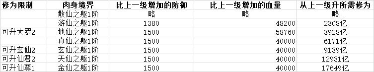 大罗1-2需要达到地仙之躯1阶,玄仙1-2需要玄仙之躯1阶,仙君1-2需要天仙之躯1阶,仙君10-仙尊1需要金仙之躯1阶。再后面,肉身就没有要求了(或者说,把肉身需要的经验增加到了修为里面,后面修为递增的速度远超前期)。