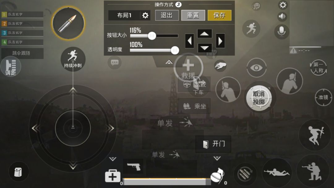 这个是我的界面设置,不冲突的按键尽量重叠在一起,就像上车下车、开镜跟取消投掷。