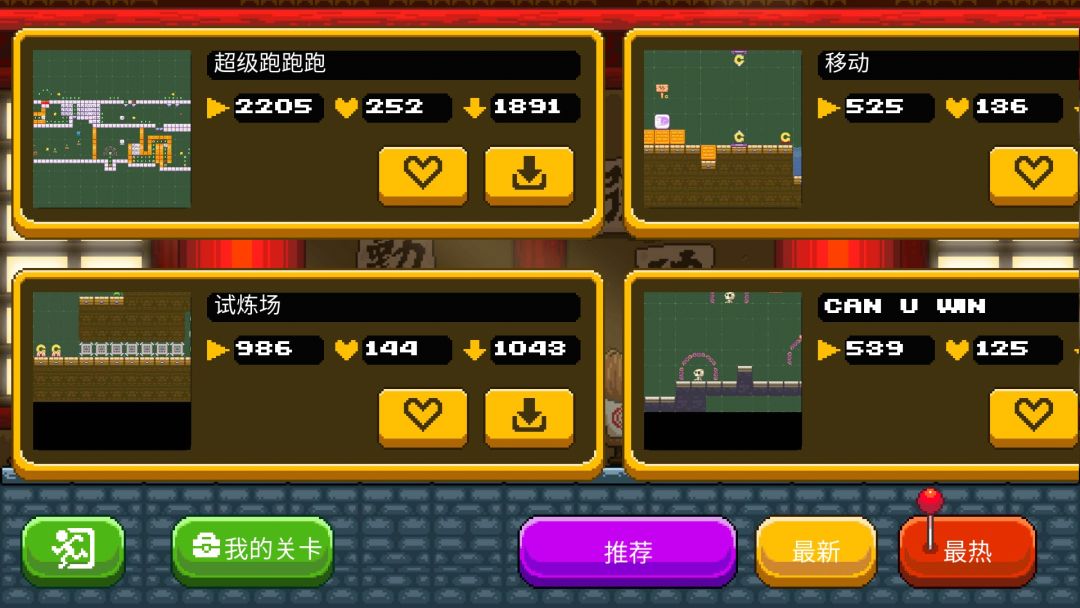 同时本游戏也支持上传关卡与下载关卡,每天都能有新花样!