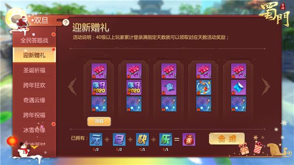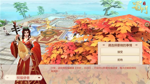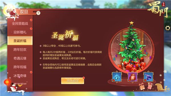 喜迎双旦,暖冬祝福。蜀门世界中达到30级的玩家可前往成都城中寻找祝福使者进行对话,提交道具【你好,2019】便可获得奖励,并且可增加祝福值,当祝福值达到满值后,便可获得2张跨年狂欢的门票。