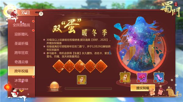 祈福迎新,跨年狂欢。活动期间,蜀门世界将会开启跨年狂欢副本,玩家们每日有两次免费进入副本的机会,次数用尽后,需要使用跨年狂欢门票进入。玩家需组队前往副本,活动中不仅会掉落一些日常装备,还有机会获得永久腰饰、改名卡、坐骑等,更有机会可获得【洛天依限量周边】的实物奖励。