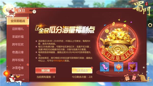 来自蜀门世界的玩家们,在双旦活动期间参与全民答题活动,将有参与瓜分海量福利点的机会。玩家们每日有2次免费参与答题的机会,获胜将获得星星,活动结束后,排行前100名的玩家都将获得新增称号,星数达40以上的玩家更可平分9990点福利点奖励。