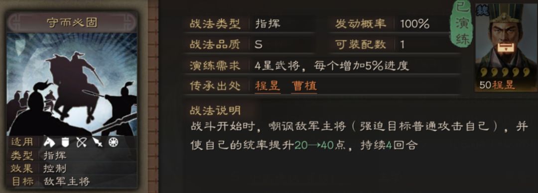 指挥战法【守而必固】:战斗开始时,嘲讽敌军主将,并使自己的统率提升,持续4回合。