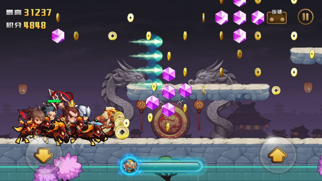 今天与大家分享一下我打无限之境的心得!其实写这攻略很纠结,因为若大家也能刷高分,那对我这零元党威胁很大!毕竟每日有排名奖励!但想想,还是与大家分享一下吧!1.必须有肉盾奶妈,战斗力要够高【这又是废话,我战斗力够高,看你攻略干嘛?!】2.必须要有邪道辅助一一减速【这个以前的攻略有提到如何减速的,减速能大大避过boss的攻击,特别是吕布和机器吕布这死变态,我怎么全灭也不知道!】3.这无限之境,想拿高分,一是要消灭所有小敌人,二是要消灭boss,三是要尽量拿多点金币!第三点最重要!经我小器验证,拿金币所取得的积分最多最厉害!因此,在7500积分以前,一定要刷出大型的跑马夺金【如图,注意,一定要是超大型那种,骑着马吸超多金那种!因为有很多假的小型跑马夺金的!】若在7500积分以前刷不出来,马上关机重打!打到刷出来为止!事实证明,刷出大型跑马夺金,积分会暴胀!但敌人攻击防御力却一点没胀!若那次无限之境能出两次大型跑马夺金,基本上能过3万积分是没什么问题的!问题是3万积分以后如何能生存久一点…………这个我小器还没研究到T_T