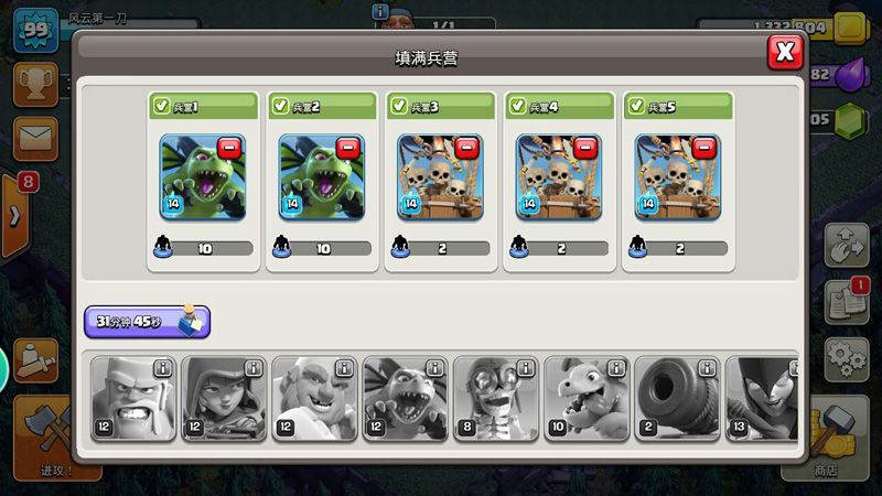 配兵组合:3个兵营骷髅气球+2个兵营异变亡灵+战争机器