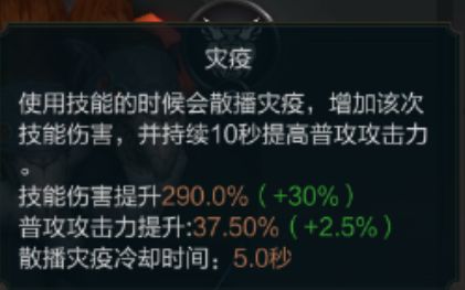 图为满级改造鼠技能,技能伤害提升290%,意为:将触发灾祸的技能造成的伤害*3.9