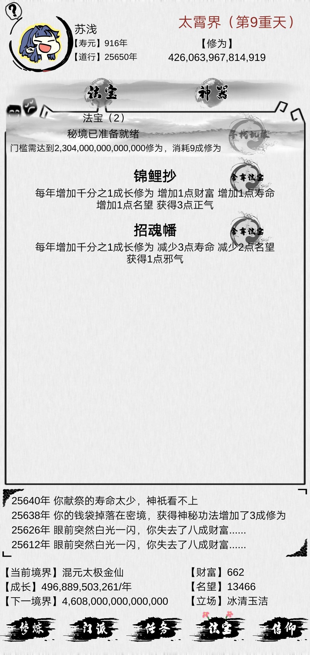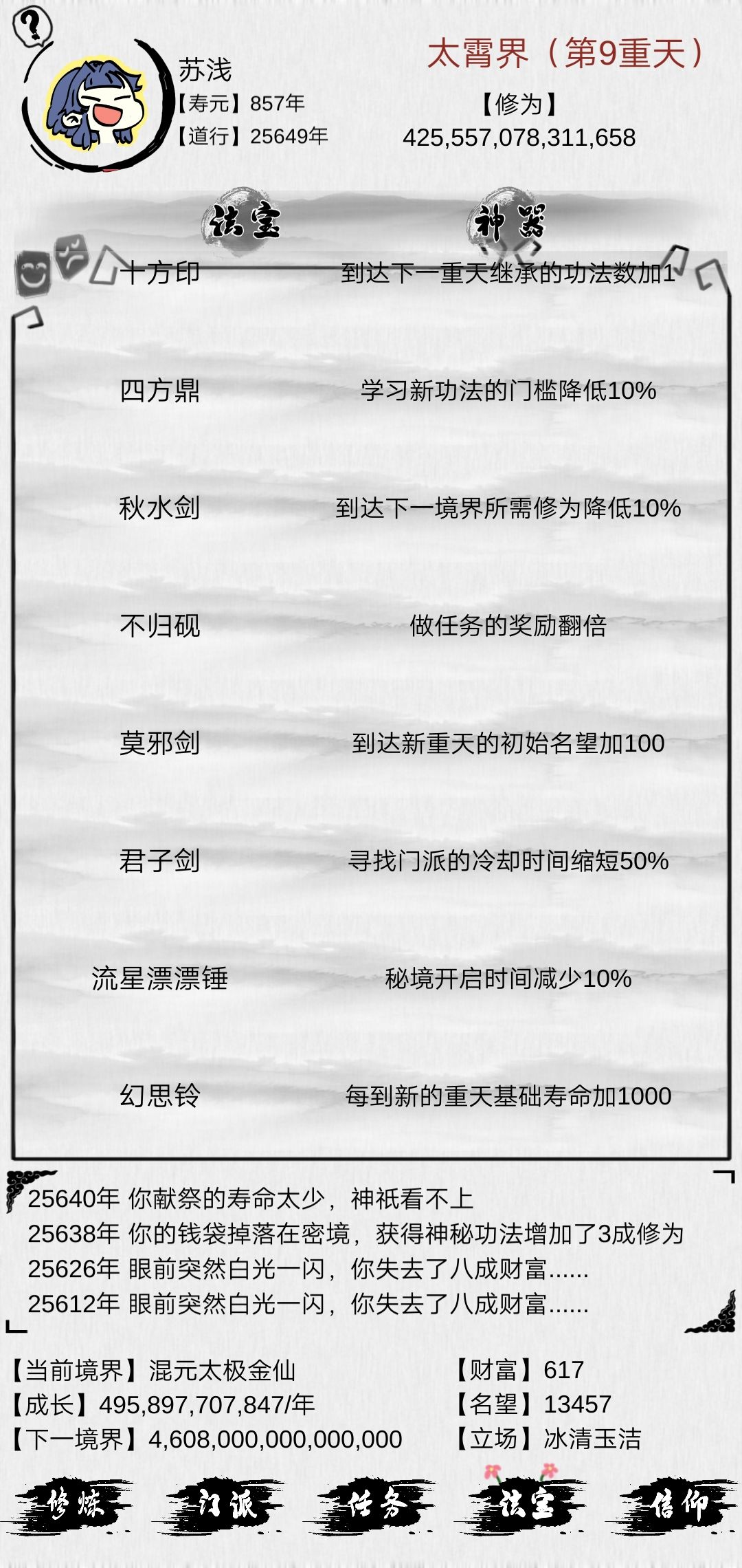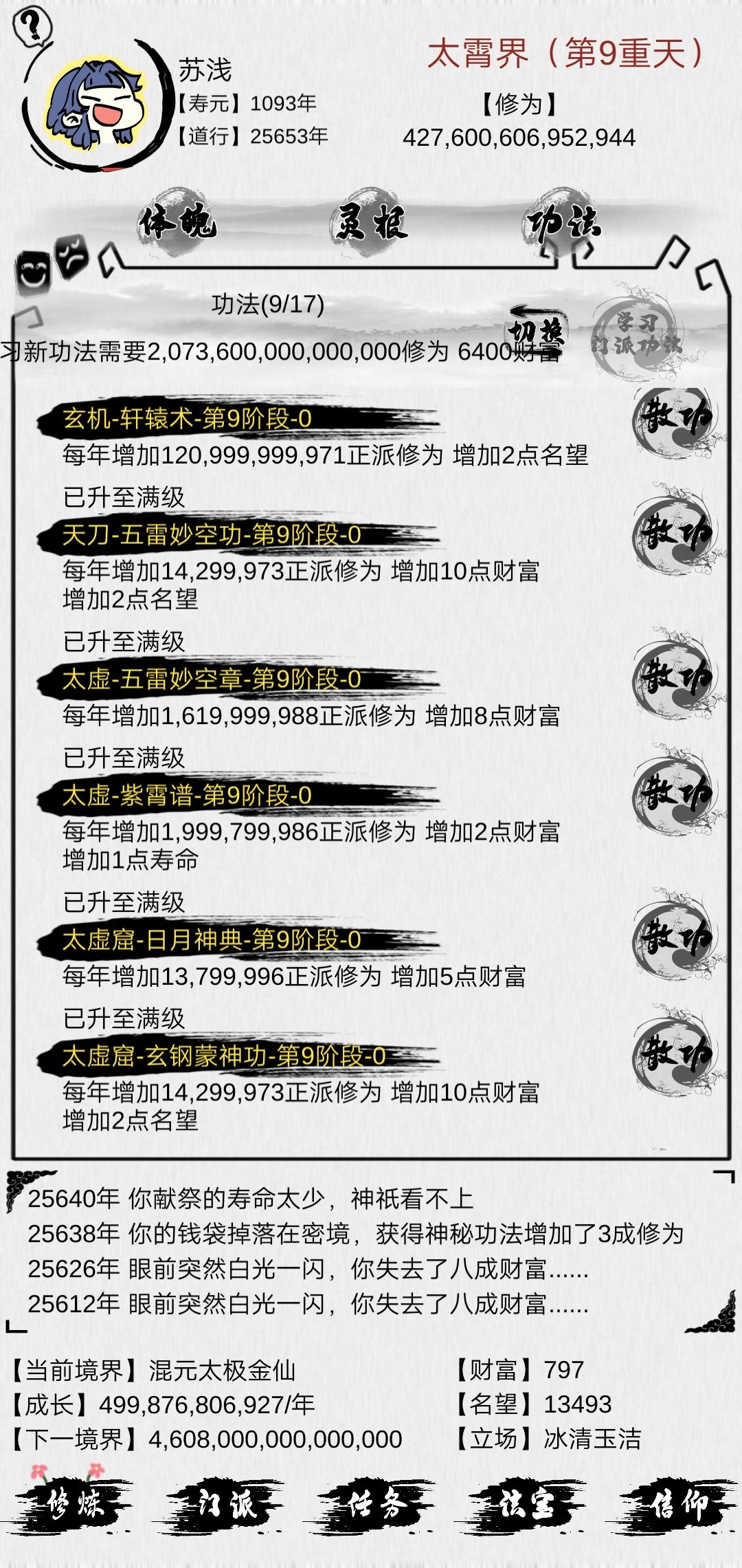 修道的时候需要找到一门加修为非常给力的功法能帮助度过前期。。我这修为功法一堆加成高的就两本,献祭这玩意死命献祭,献祭到每秒增加一成修为这层基本能通了,另外小后期还是看肉身修为。。(可以五指一起点。。加的还蛮快的)前面7重天基本可以靠功法过,虽然功法都没啥用后面就加个钱emmmm其他的别的大佬基本都讲过了概括一下
