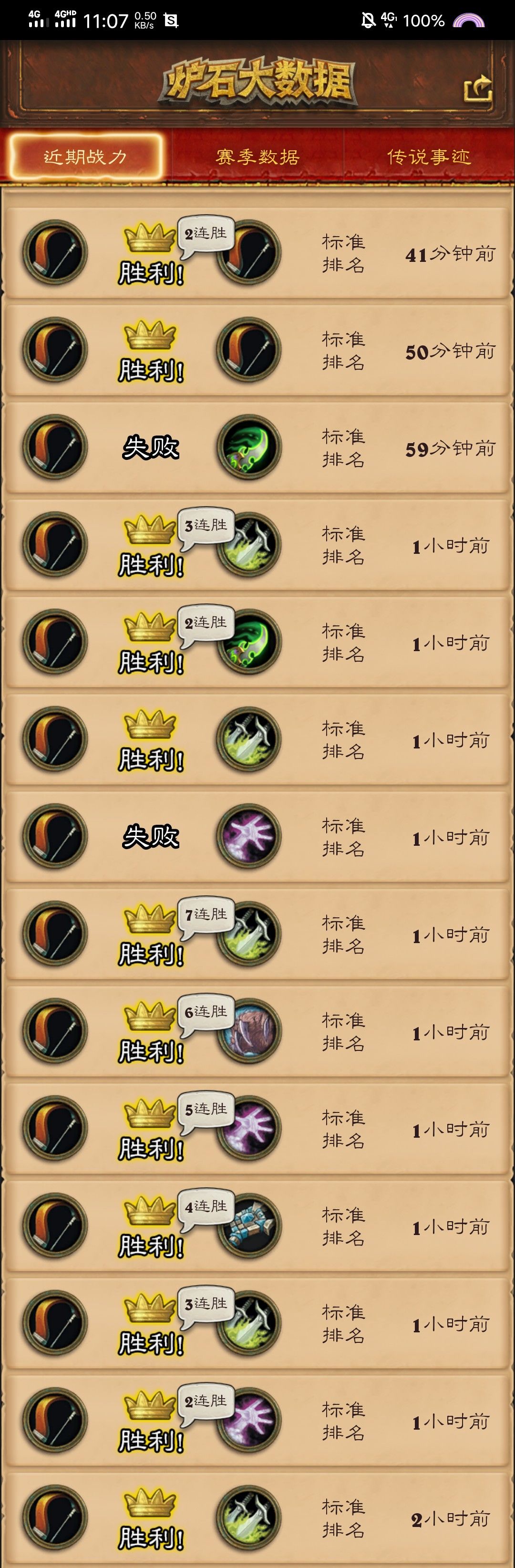 这是刚刚上午统计的对局,十五场高达80%的胜率,几乎面对任何职业都不怂的上分卡组,常青树T7猎,贫民首选,稳定不怂