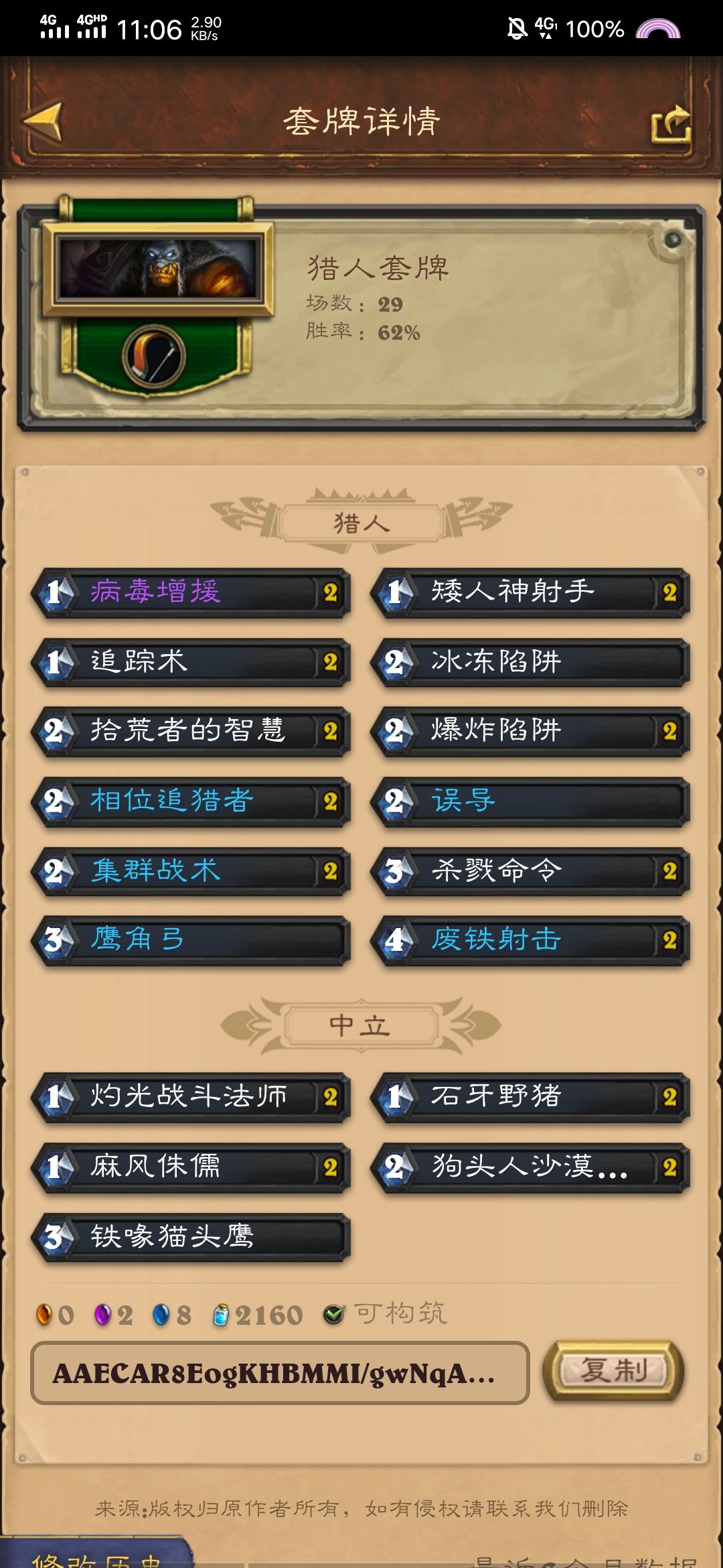 总体思路:所谓T7猎,对面一般活不过七费,用这副套牌心态一定要稳,根据情况想好每一步出牌,不要为了铺场而忘记任务的存在,合理利用奥秘打对面一个措手不及,不要一味的解场时刻记住自己是快攻,一费尽量找任务(是首选),相位追踪者,拾荒者的智慧,前期追踪术用于寻找任务,否则依据情况用于寻找卡牌改变战局完成斩杀,不是必要时刻不要下猫头鹰,尽量用它到最后过墙是首选,不要为了加buff提前留小野猪