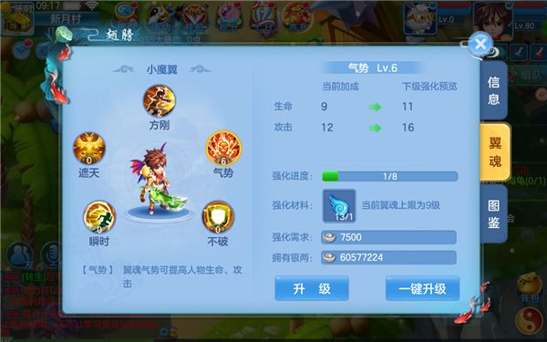 至于翼魂的强化则相对复杂,翅膀上有5个固定的翼魂,分别为方刚、气势、不破、瞬时和遮天,我们可以消耗银两和材料对这5个翼魂进行培养,要注意的是不同翼魂的强化,所带来的属性加成也是不一样的,需要书友们根据自己的角色来选择。如果你是个追求伤害的侠客,那么推荐强化气势翼魂;如果你是个想打先手的刺客,那么优先强化瞬时翼魂。合理利用好翼魂和人物加点,就能培养出更多元化的角色~