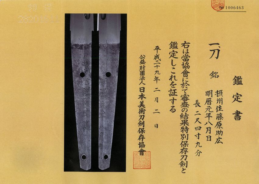 ◆最初随同初代助广使用铭文“摄州住藤原助广”。在初代助广去世后,二代助广世袭了越前守的职位。刀身的铭文改为“越前守助广”。