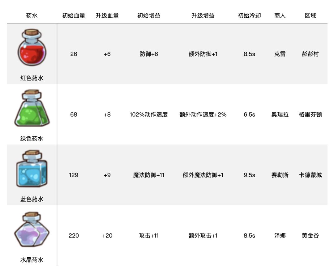 药水是可重复使用的能量饮料,可以治疗一定血量,并根据药水的类型给予额外的增益。一次只能装备一种药水。使用药水后,会有一个冷却时间,然后才能再次使用。