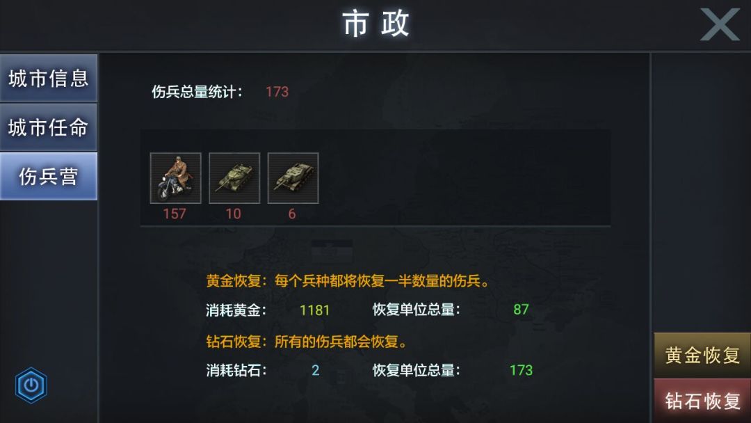 玩家用黄金可恢复伤兵营内一半的伤兵,用钻石可恢复伤兵营内全部伤兵。