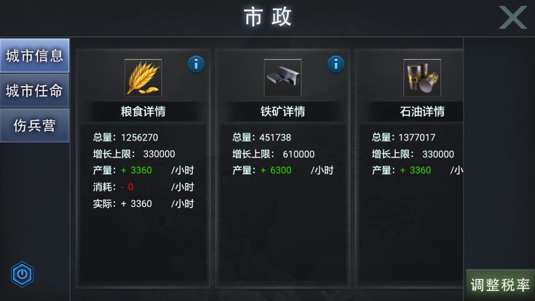 在这里,你可以看到城市内各资源总量及其增长情况,需要注意的是粮食、铁矿、石油和铝矿数量都是可以通过征服或掠夺野地获得,唯有黄金和人口不是。