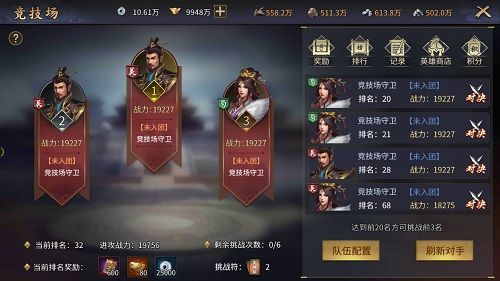 在竞技场内,玩家需要先布置自己的进攻和防守阵容(至少有1名武将上场),布置完阵容就可以从系统给出4名玩家中挑选1名进行挑战,挑战成功可取代对手的排名,挑战失败则排名不变。在竞技场升到20名以内可直接挑战排名前3的玩家。