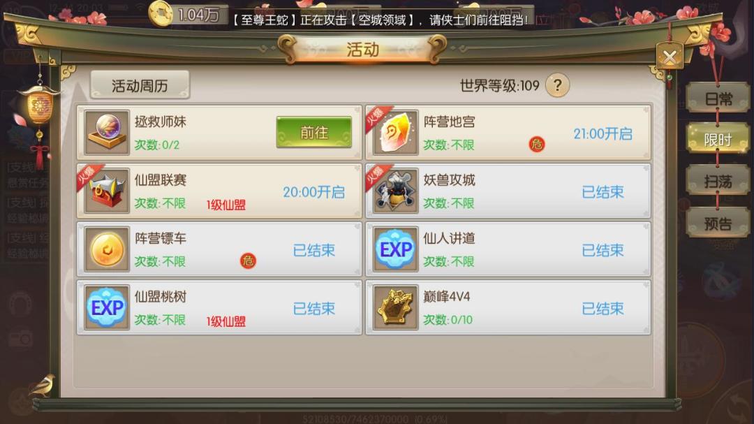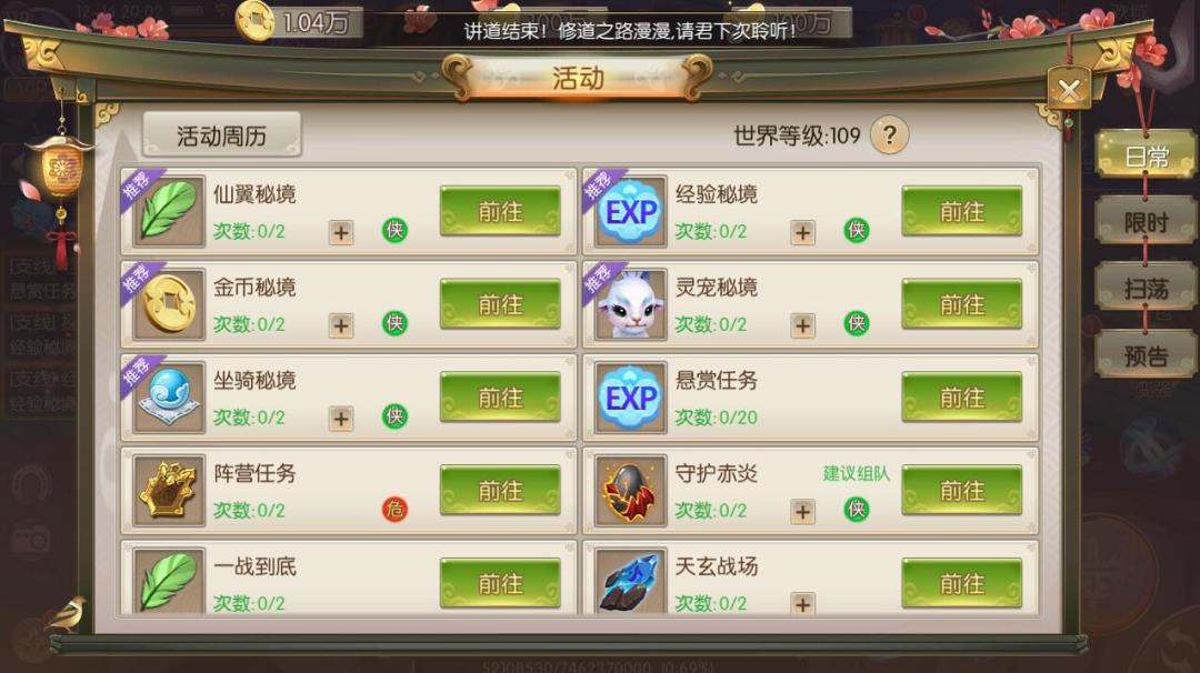 在日常任务中,分出了日常活动和限时活动两大类。日常活动有灵宠秘境、金币秘境等,活动完成的时间全天不限。限时活动则是在固定时间段开启,例如巅峰4V4、仙人讲道。上仙点击显示活动版面便可看到对应活动的开启时间,部分活动需要提前报名参加,上仙可千万别错过了呢。