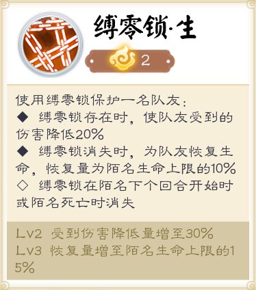 使用缚灵锁将自己与一名队友链接。当缚灵锁存在时,链接队友受到的伤害会降低30%;缚灵锁消失时,还会为队友恢复生命,恢复量为陌名生命上限的15%。(缚灵锁会在陌名下个回合开始前或者陌名死亡时消失)