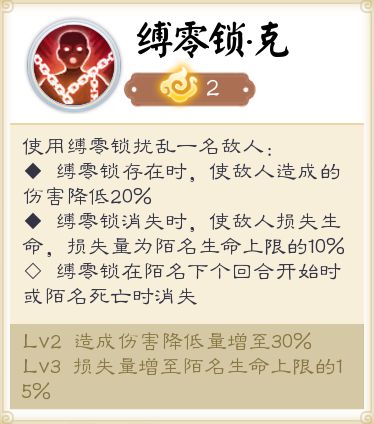 使用缚灵锁自己与一名敌人链接。当缚灵锁存在时,受到链接的敌人所造成伤害降低30%;缚灵锁消失时,会使敌人损失生命值,损失量为陌名生命上限的15%。(缚灵锁会在陌名下个回合开始前或者陌名死亡时消失)