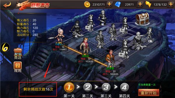 商船挑战分为4层,每层有3列4行,一共有48个敌人,击败每个敌人都可以获得相应的资源材料(魂石、宝船积分)。但是关键点在于,每次商船挑战的总挑战次数只有16次。