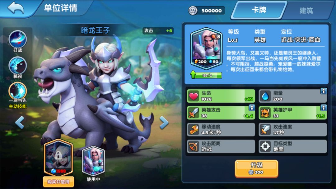 ▍新版本中,我们为疾风王子制作了专属皮肤——暗龙王子,只需要1888钻石就可以获取种族争霸第一款皮肤哦!同时使用暗龙王子皮肤,将会提升6点攻击力哦!