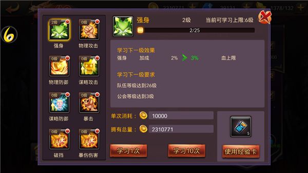 公会技能卡,公会技能属于全体的百分比加成,在金币匮乏的情况下,公会经验卡是唯一的提升途径