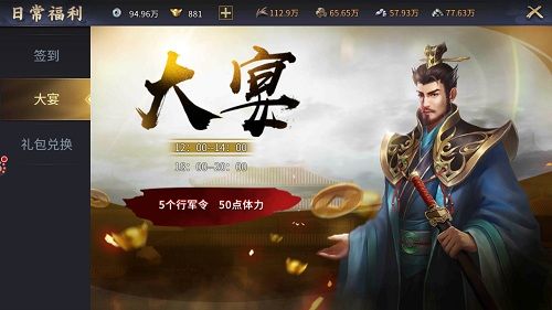 体力可以通过等待系统每6分钟自动恢复1点或者使用体力恢复道具“包子”进行快速恢复,也可以在每天的12点到14点以及18点到20点之间登录游戏,通过定时活动“大宴”来获取体力。