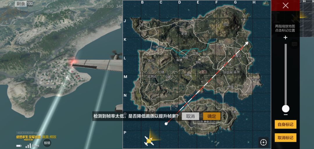 在游戏进行到中后期,所在的安全区比较小,小地图进行放大后可以看到黑色格子里分布着10×10个白色小格子。每个小格子边长100m,在游戏中后期用于测量敌我距离有着至关重要的作用。