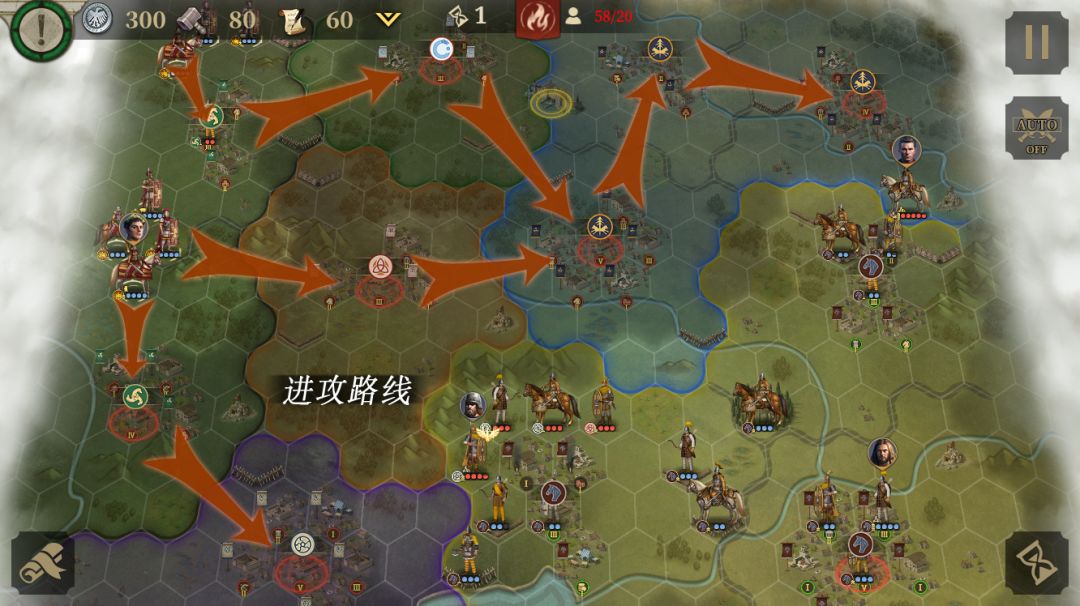 本关的目标是消灭所有敌对国家,20回合达成是2星,16回合达成是3星。本关需要注意的是,敌对国家在3回合会假装投降,然后到了第9回合这些人会再次叛变回去变成敌人。所以在进攻的时候要注意留一些部队防守城市,不要等到第9回合被打个措手不及。开局兵分两路,按照图示路线攻城。如果不追求3星的话20回合是肯定来得及的。黄圈是2张突破卷轴。
