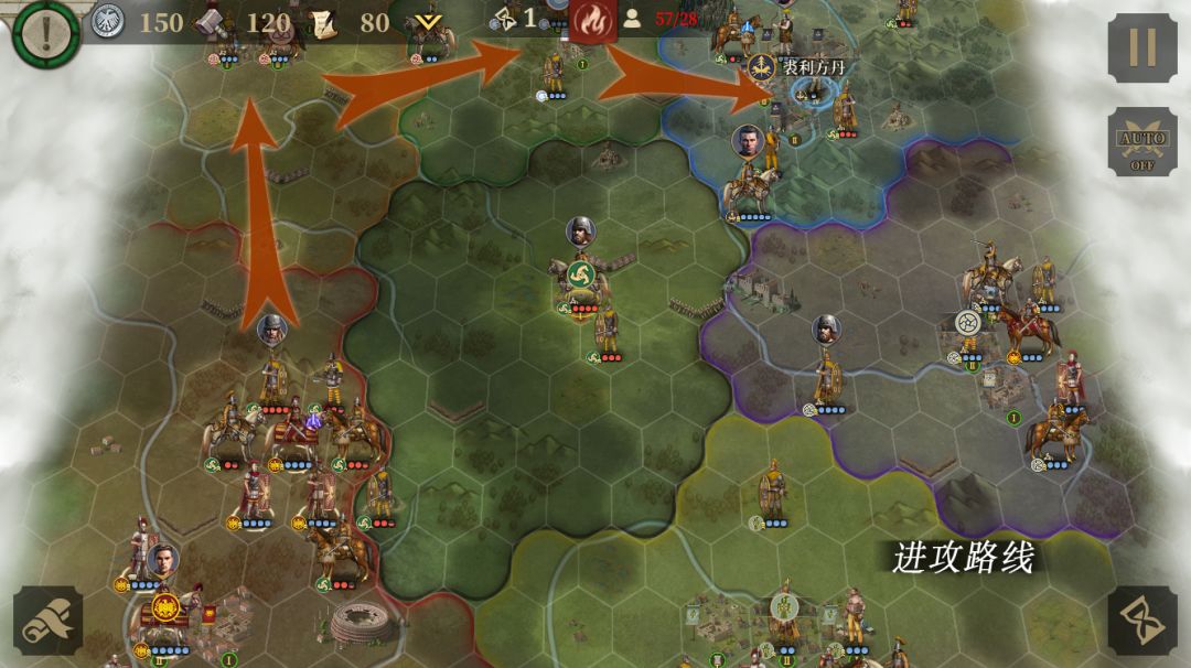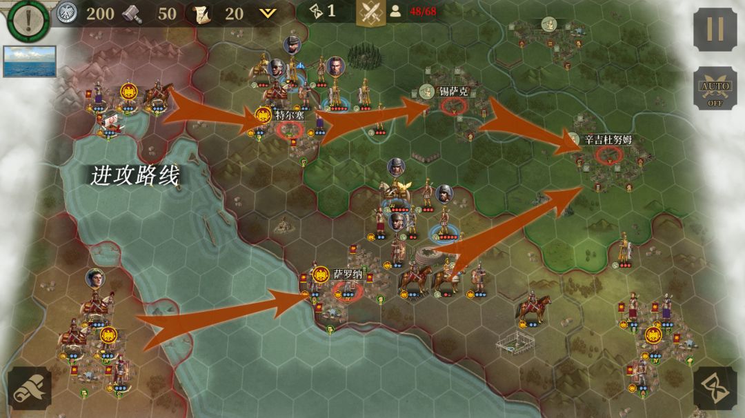 本关目标是占领5个关键地区,击败45支敌军,经济达到4000。由于本关目标有经济要求,前期占城要注意运营。按照图示路线进攻,敌方有不少蛮族勇士,打我们重甲很痛,注意不要把标枪手送到他们脸上。可以多出一些投石兵,便宜又好用。右边的敌方势力马西战败后,左下角罗马势力进攻腾科特利。