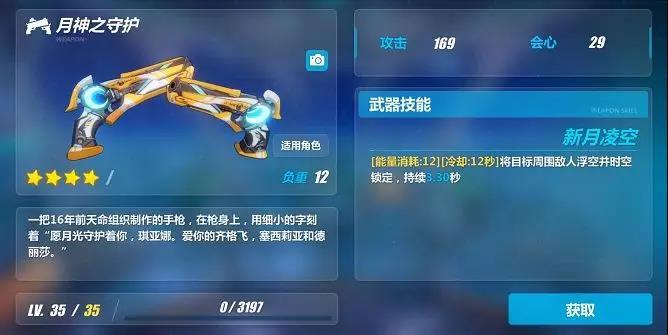 月神之守护:累计充值10水晶的赠品,对于大多数玩家来说,是第一张月卡的附属品,当然也可以通过主线剧情的任务获得。虽然只能升到4星,面板也不出色,但是主动技能可以造成浮空和时空锁定,而且冷却时间和SP消耗都不高,因此,常常被作为团队中的QTE发动机,性价比极佳。