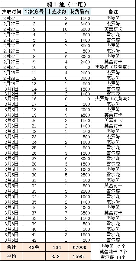134发十连,共花67000石,出货42金,平均3.2发十连出货,平均成本1595石,平均出货率3.1%。其中杰罗姆21个、芙蕾莉卡7个、雪尔森14个。