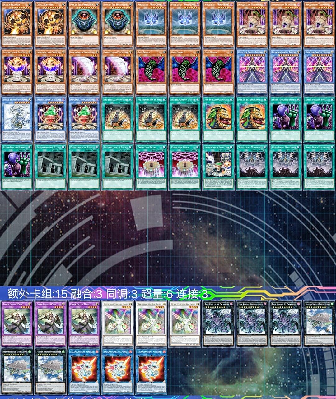 机怪神 超机怪虫神2 禁忌之壶2 卡组压制核心,R9核心星遗物 星冠3,星遗物的胎导3,检索两只反转怪,R9初动,星遗物 星冠(测试中,龙落亲(神子检索?登龙肥婆?刺刀斩杀?)神仪 护草3,神仪一人偶2,神仪一钢笔2,神仪一史莱姆2,神仪一祝涎1(仪式怪兽多,仪式魔法少,调整中)圣占术姫 塔罗光巫女3(运转核心,百分百必须仪式,仪式不出,卡组报废。)圣占术的仪式2。狂风毒蛾3(一卡仪式,一次效抗,解场),愚蠢的重葬3(解场,检索)仪式的事前准备3(大腿卡),仪式的准备3(抗性,检索,回收(小腿卡)强贪壶2(仪式大腿卡,强欲之壶?壶抽壶。)额外:转生炎兽 独角兽3,真龙皇法王兽3,幻子力空母3,虹光宣告者3,旧神3综合评价:斩杀能力:☆☆☆ 先手展开能力:☆☆☆ 后手解场能力:☆☆ 后手干扰能力:无星(可投入陨石,里侧规避解放。) 压制能力:☆☆☆☆求占术姫玩家告诉我怎么修改这副卡组!新卡九命猫TCG独有MD。宣告者神托厉害(堆硬币地精,检索,解场,效抗)