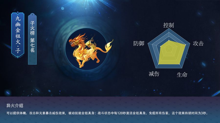 九幽金祖火可以提供体魄、攻击和元素暴击减伤效果。被动技能金祖真身:战斗状态中每120秒激活金祖真身,免疫所有伤害,这个效果持续时间为3秒。九幽金祖火的被动技能是免疫所有伤害,相当于在这3秒内是无敌的状态。