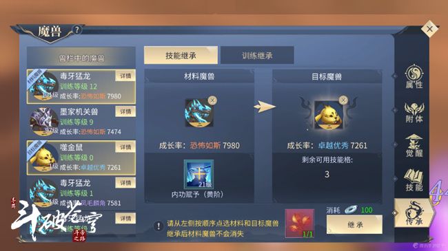第一个可以选择学习增加魔兽自身物理攻击的怒意技能;雷族和药族第二个选择增加主人内功的内功赋予,萧族、石族和灵族选择增加主人力量的力量赋予;第三个选择增加主人体魄的体魄赋予。这三个技能分别增加了魔兽自身的物理攻击和主人的法术/物理伤害以及主人的生命值。