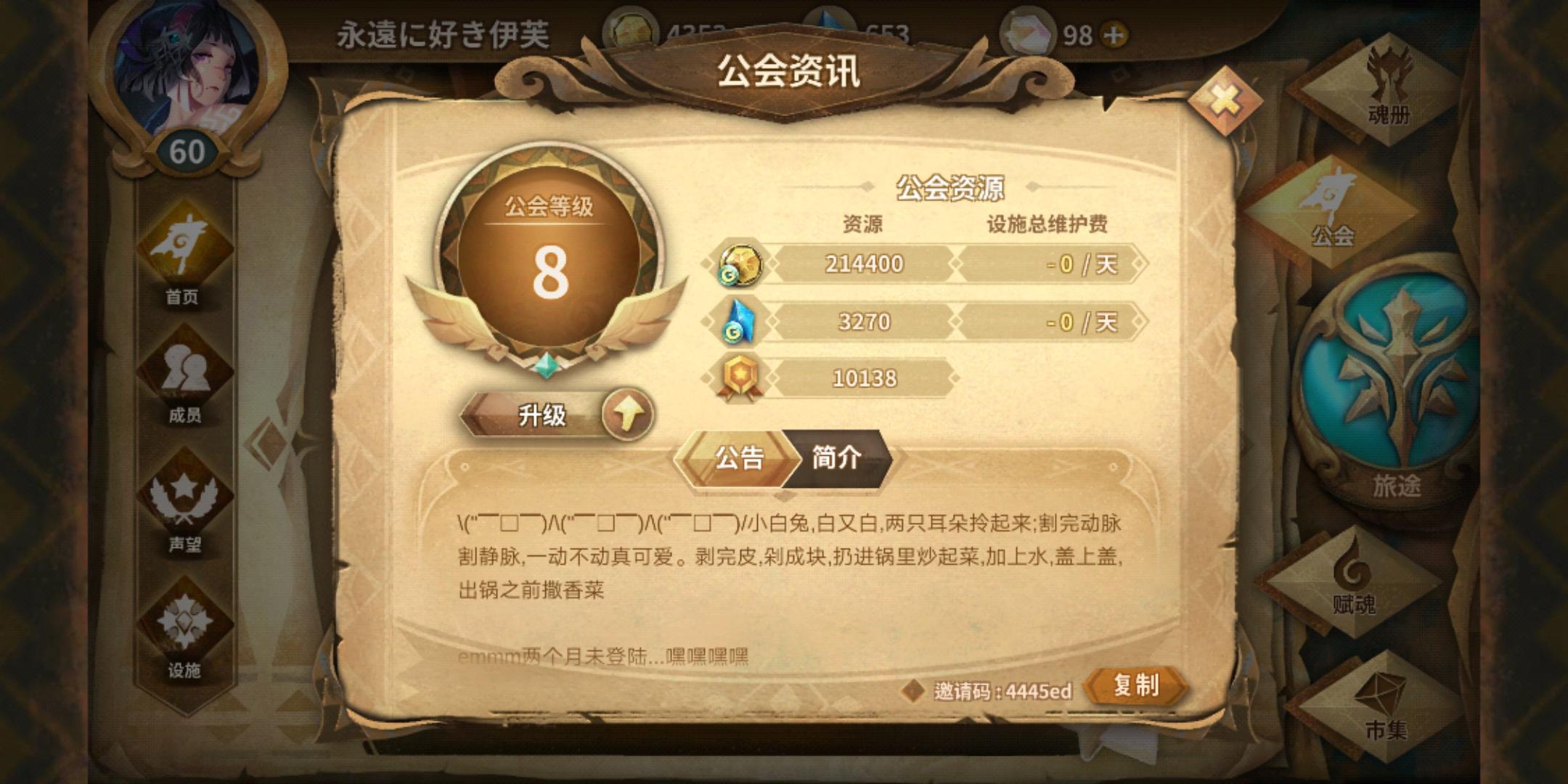 公会刚升到8级,比较缺人,欢迎活跃的来