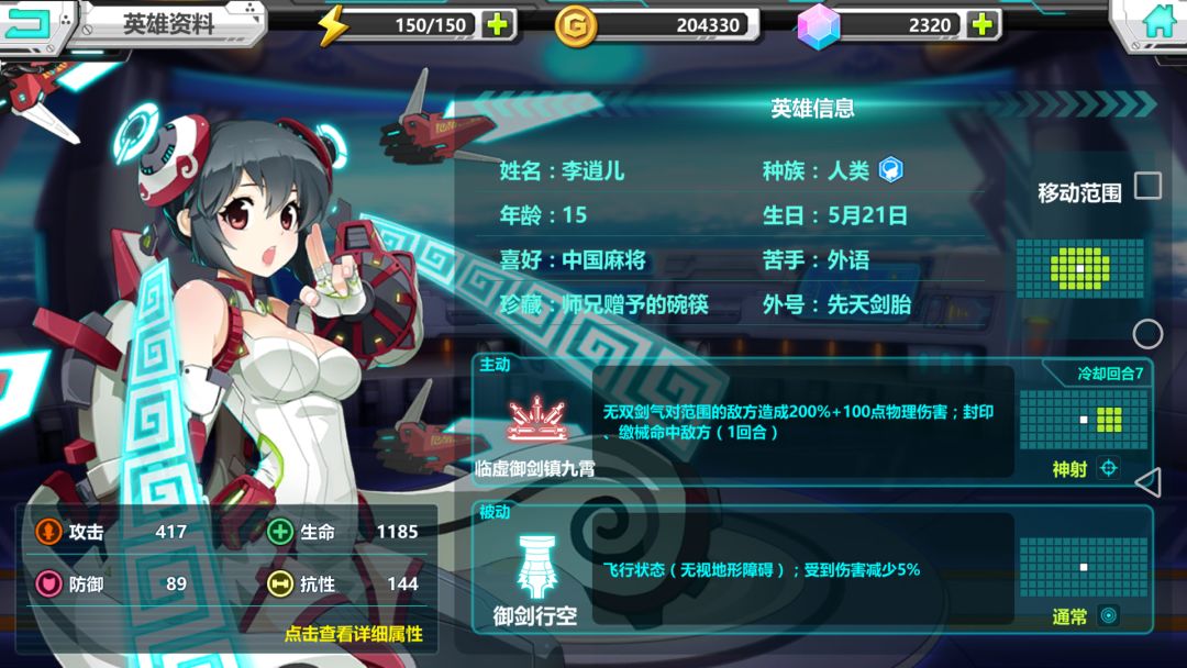 李逍儿是高机动性角色,移动范围有三格,可以快速突入战场,或者绕后切后排等,同时其被动御剑行空能无视地形障碍,这使得李逍儿可以适应任何关卡的环境,再加上她的武器有多种功能,有输出装、辅助装、治疗装,可以说李逍儿这个角色在目前的所有角色中是最为全能,最为泛用的。主动技能虽然冷却回合长达7回合,算是较长的冷却回合数,但是一回合的封印+缴械可以同时控制住命中的敌方的普通攻击和技能攻击,简单说,在这一回合中,被这个主动技能命中的敌方很难有有效的反击手段,在手操的情况下,能够有效地保障队伍的生存或者提供可观的范围输出。