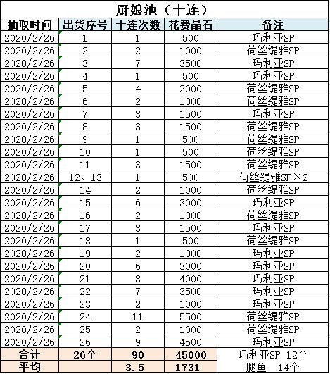 90发十连,共花45000石,出货26个,其中玛利亚SP 12个,腿鱼14个。