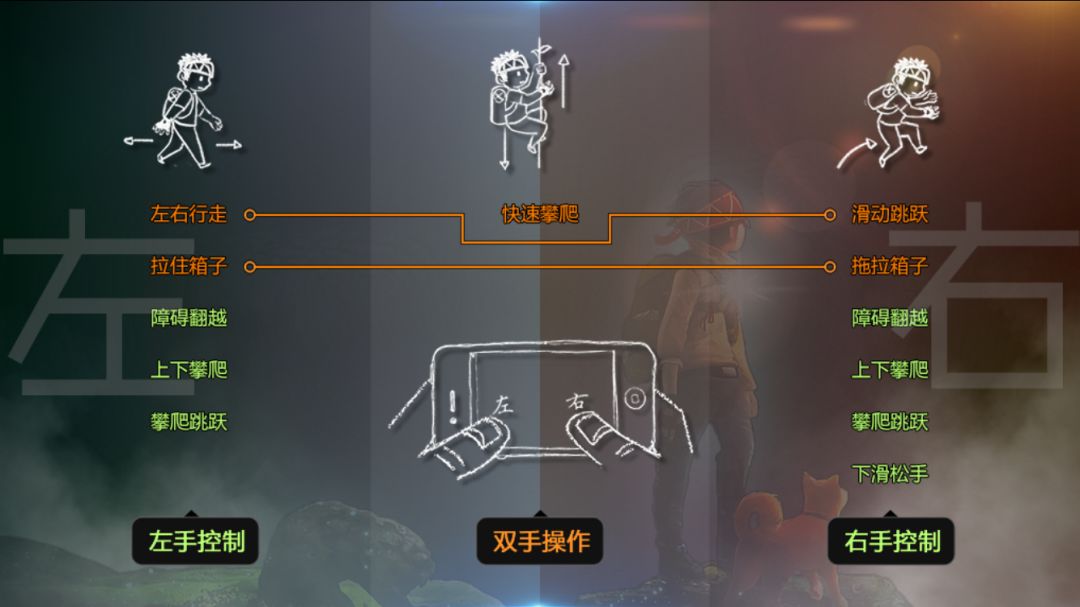 操作如下图所示:左右手分别控制人物的行走、攀爬以及跳跃。