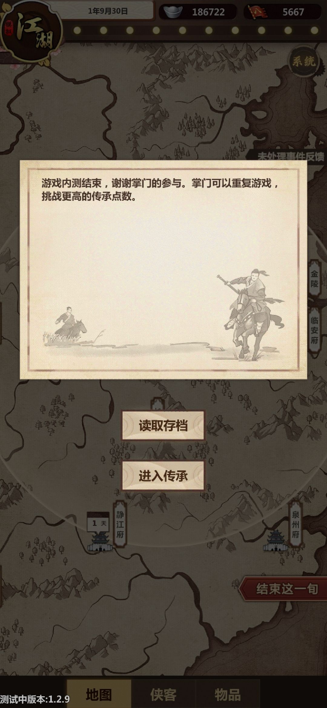你就发现底下时间还在走,银两声望还在算,随机事件还在出,直到9月30日还照常显示结束这一旬。只不过被内测结束的弹窗挡住了,点不了罢了