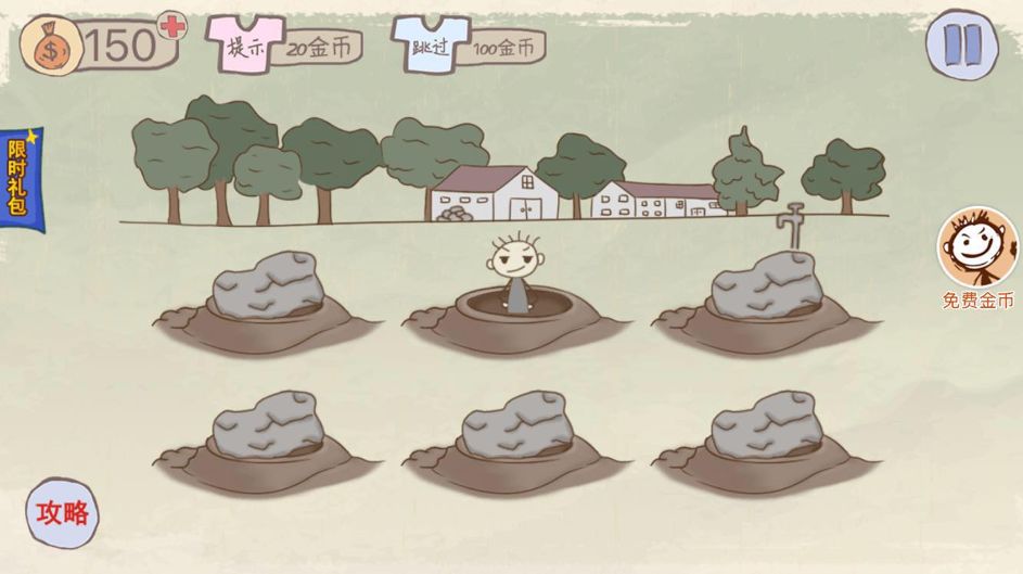 除了明显的场景提示,有些关卡中通过相反的方式将关卡要素隐藏到“背景”之中,如本关中,通关所需的石头藏在远处房屋角落,点击它才能取得堵住洞口的石头。