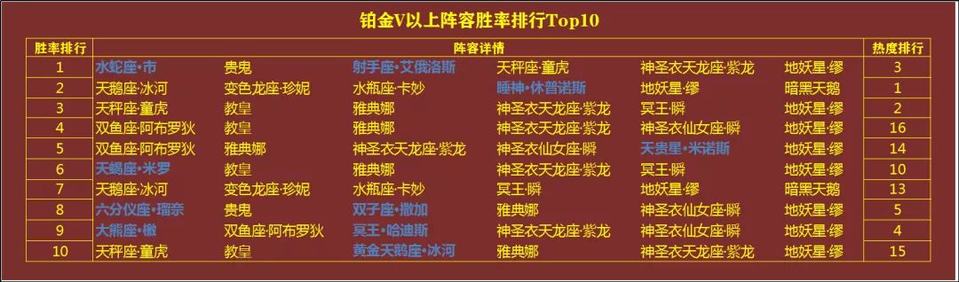 作为老牌神圣衣一辉队,本阵容的登场率依然在阵容排行榜中名列前茅,只不过因为众星意志的提升,导致神一辉与加隆的针对性有所下降,使得本周的胜率也有了一定的下滑。但这套阵容的打法依然很强势。