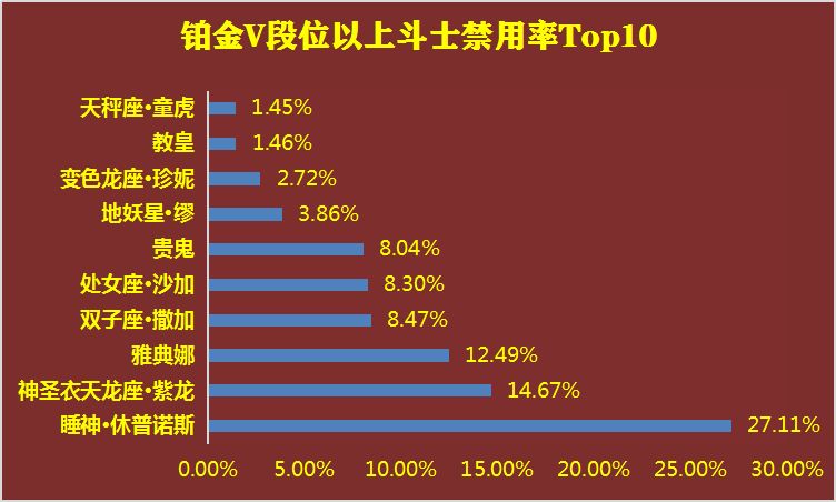 本周睡神禁用率激增高达27.11%,大部分原因是月初上分大家追求效率,不愿面对这种耗费时间的阵容,另外童虎和蝴蝶上榜,蝴蝶很大一部分原因是因为控制斗士上场率升高而导致禁用率激增。