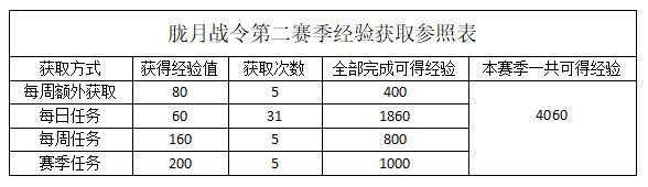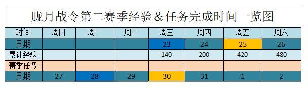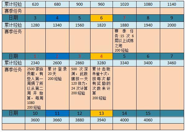 浅蓝色底纹为累计经验栏,深蓝色为日期栏,天蓝色底纹为每周额外80经验领取日期,黄色底纹为每周任务完成日期(因任务和每个人完成方式不同所以每周任务统一每周第三天计算),红色字体为赛季任务完成日期,每100经验为一级。