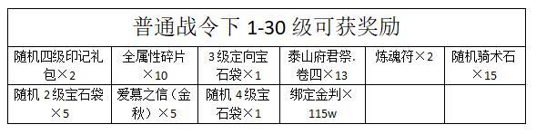 (1)在不进阶战令的情况下我们升到30级(未进阶高级战令30级后无奖励)可以获得下图/表内奖励: