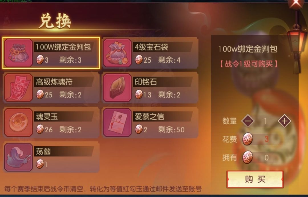 与上赛季一样,赛季挑战的15个战令币和高级战令31级-40级的100战令币一共可以获得115战令币。这赛季的战令商店与上赛季的不同之处是把限购两个的65级橙魂任选箱换成了限购四个的随机四级宝石袋,其他与上赛季战令商店相同,当然如果没用完可以等值换成勾玉(转换比例为1:9.8)。