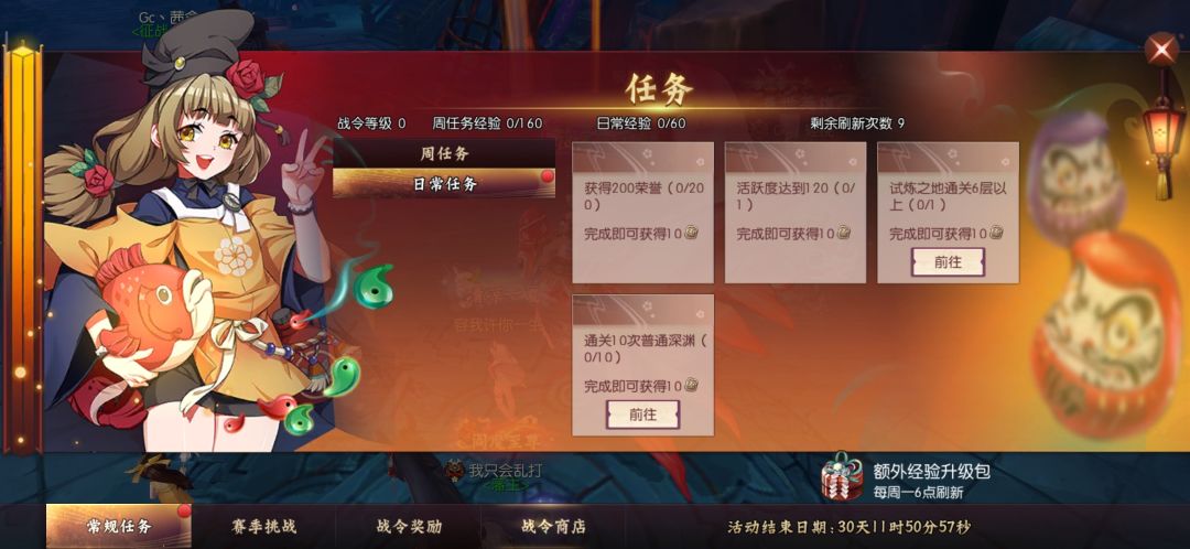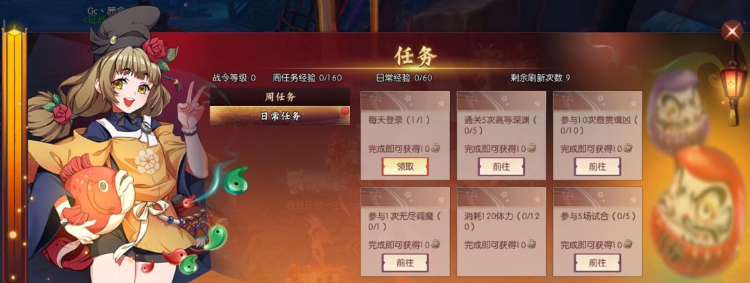 每日任务顾名思义每日刷新一次,一共10个任务,每个可以获得10经验,但是每天上限60经验所以我们挑其中六个容易完成的做就好。推荐选择每天登录、消耗120体力、活跃120、一次无尽阎魔、5次高等深渊以及10次普通深渊这六个,这六个基本上每日都会完成既不刻意也不冲突。