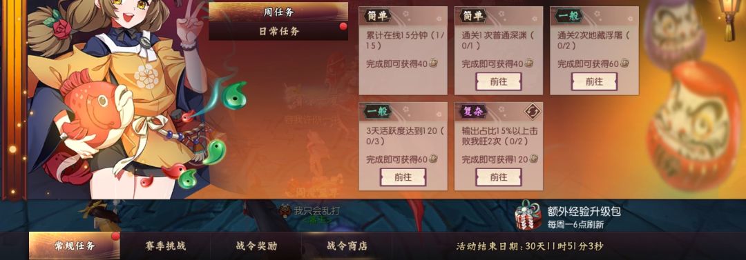 因为一共有五周所以每周额外和每周任务都是5次,赛季任务5个,每日一共31次。