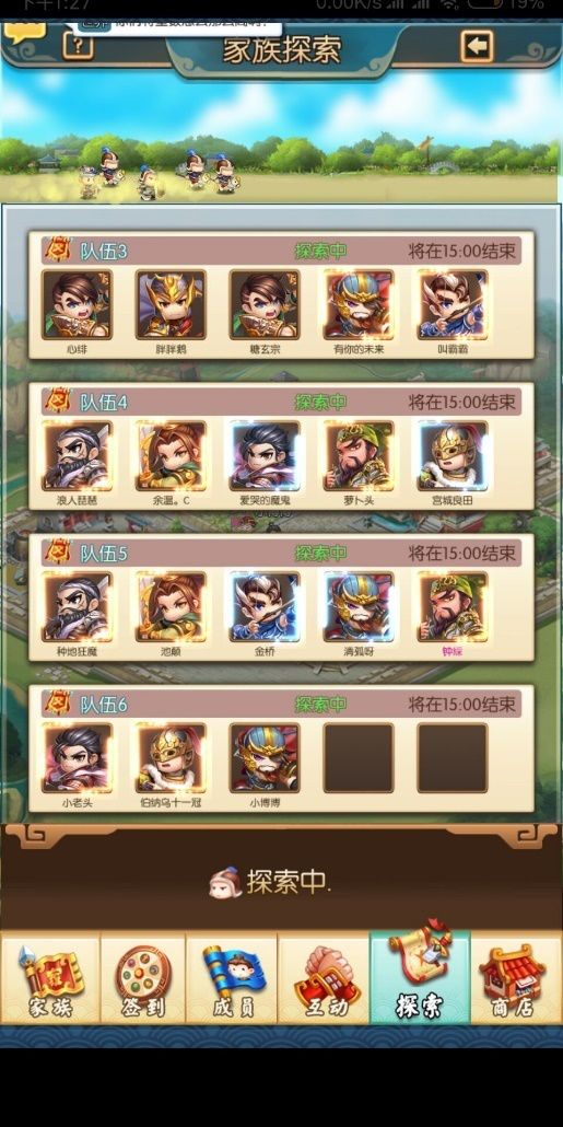 最后再说一下家族探索,我发现很多家族成员不重视家族探索,探索一直都是上廖化,或者一些其他的武将,这个是错的,探索武将只要组成情义探索,是能够额外拿情义箱子的,能开出武将卡,还有鸡腿,烤猪等体力物品。